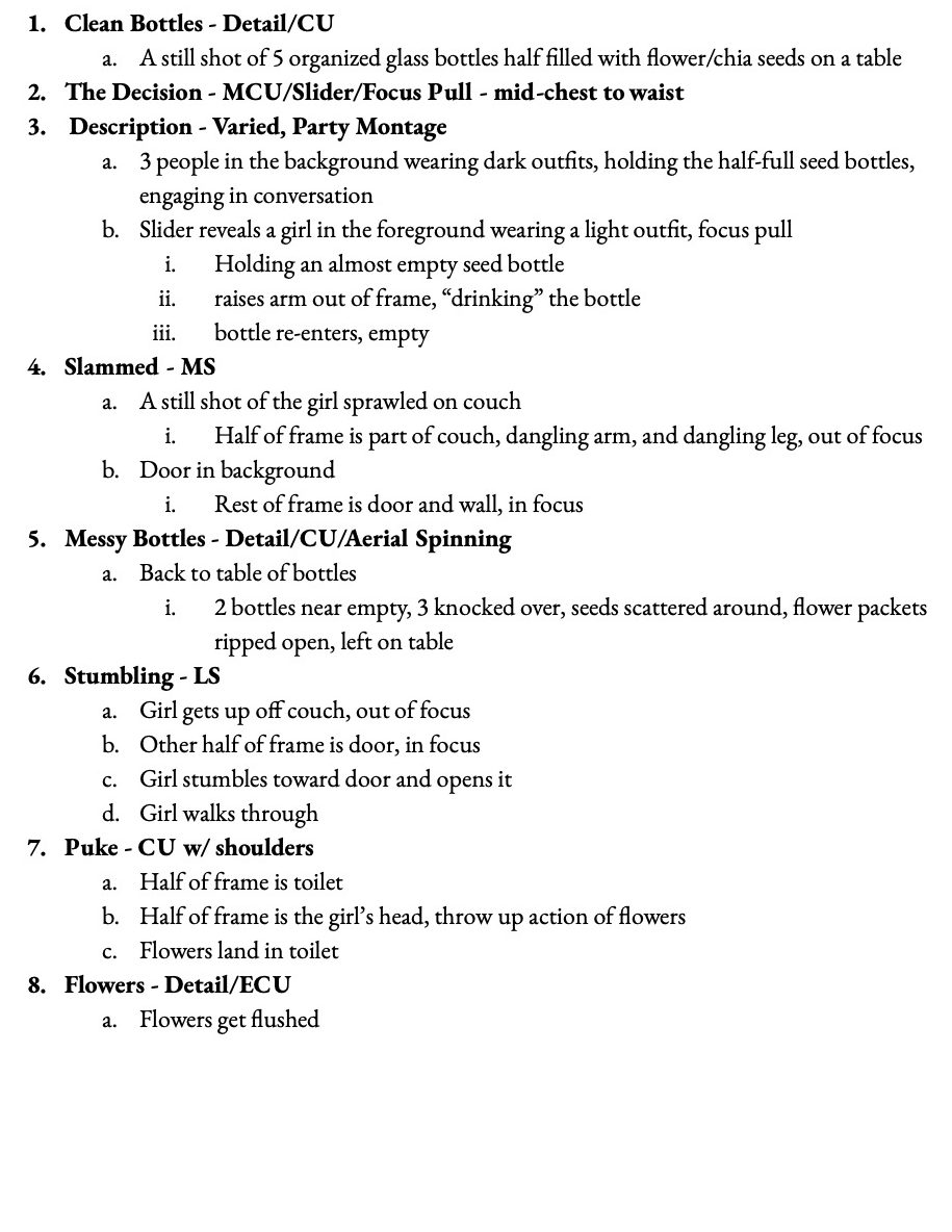 The Life and Death of a Flower was a micro-short film that I wrote, directed, and edited at Olympic College. After I came up with a few several word short stories, I chose “drink seeds / throw up flowers” and created a film in which a girl’s innocence is juxtaposed with that of a flower’s.